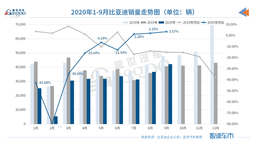 10月9日,比亚迪发布2020年9月销量快报。数据显示,比亚迪当月销量为42,183辆,较去年同期的40,729辆微增3.57%,环比8月增长14.7%。至此,比亚迪前9月累计销量达268,975辆,同比下滑19.9%,降幅较8月进一步收窄。