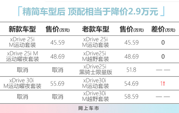 黑骑士限量版和xDrive30i M越野套装2款车型,相当于顶配车型价格下调了2.9万元。此外由于新车增加了曜夜版外观套件,车型名称也进行了调整。