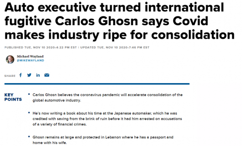 戈恩在接受CNBC采访时表示,疫情期间,即便疫苗能够得到批准和推广,汽车公司也需要一年时间才能恢复正常经营。汽车行业整合速度进一步加快,并且继续朝着电动化、自动驾驶的方向发展。许多公司将因此陷入困境,甚至无法存续。那些“缺乏远见”的公司可能会被实力更强的车企所收购。