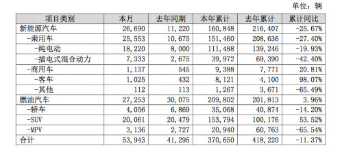 值得注意的是,插电式混合动力车型、商用车和客车方面11月份销量同比大幅增长。
