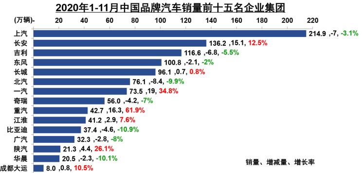 近日,中国汽车工业协会(简称“中汽协”)发布了2020年11月汽车工业经济运行情况,数据显示,2020年11月,中国汽车市场共实现销量277万辆,同比增长12.6%。2020年1-11月,中国车市完成累计产销量分别为2237.2万辆和2247万辆(含商用车),同比分别下滑3%和2.9%,降幅进一步收窄。那么,前11月头部中国品牌车企的销量表现如何呢?