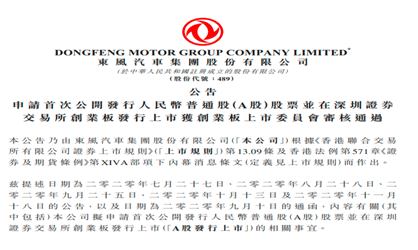 12月11日,东风集团股份(00489.HK)发布公告称,深圳证券交易所创业板上市委员会2020年第55次审议会议于当日召开,根据会议审议结果,东风汽车集团股份有限公司A股发行上市的申请已获创业板上市委员会审议通过。
