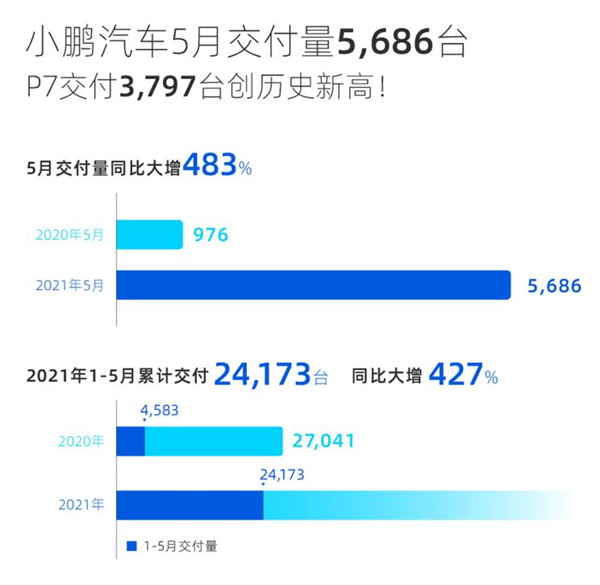 日前,小鹏汽车公布了该品牌在2021年5月的交付量为5686辆,较比去年同期增长483%。其中小鹏汽车P7在5月份的交付量为3797辆,该车创下自2020年7月份大规模交付以来的最高月交付记录;而G3在5月份的交付量为1889辆,同比增长129%。同时截至2021年5月底,小鹏汽车本年度共交付24173辆车,达到去年同期交付量的5倍。