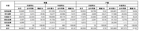 6月8日,长城汽车披露2021年5月产销快报,当月实现销量86965辆,同比增长6.18%;当月实现产量80950辆,同比增长0.76%。2021年1-5月,累计实现销量517547辆,同比增长65.32%;累计实现产量503869辆,同比增长63.82%。
