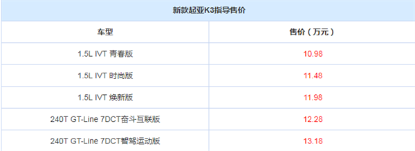 近日,我们从起亚官方获悉,新款起亚K3正式上市。新车共推出5款车型,售价区间为10.98-13.18万元。新车作为年度改款车型,主要是针对配置进行了调整,整体价格浮动不大。