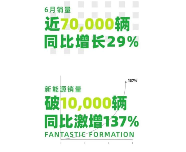 7月5日,上汽乘用车公布其6月销量,旗下荣威、名爵、R汽车等品牌车型销售近7万辆,同比增长29%;新能源车型销量破万,同比增137%;海外销量破2万辆,同比增长124%。