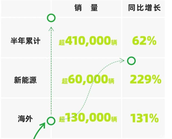 半年来,上汽乘用车累计销售超410000辆新车,同比增长62%;新能源共销售超60000辆,同比增长229%;海外销售超130000辆,同比增长131%。