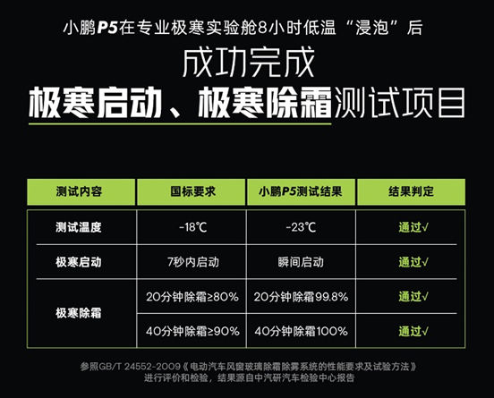凛冬季节,为了聚焦用户冬季行车中低温启动和低温除霜的真实痛点,小鹏汽车模拟用户冬季真实的用车场景,在行业权威机构中国汽车技术研究中心,小鹏P5进行了一场比国标测试温度更低的极寒测试(国标测试要求-18℃,本次实验-23℃),以更低的温度,更快的启动和除霜速度,成功通过极限测试。