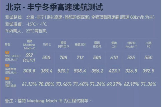 其次,是将测试线路设定在由北京至丰宁高度路段的《新出行》,测试当天的平均气温低于0℃,最低达到了零下15℃。测试车辆沿用了 XCX-TEST 续航测试标准,即驾驶模式为经济,动能回收最大,空调为两挡风23℃。