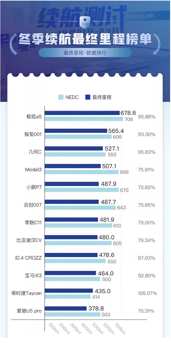 《AutoLab》选用的车型同样是极狐阿尔法S的2021款708S+车型,官方标题续航里程为708km,实际测试成绩为678.8km,续航达成率接近96%。与同一期参加测试的车型相比,极狐阿尔法S凭借优异的表现遥遥领先,是唯一一款实际续航超过600km以上的车型。