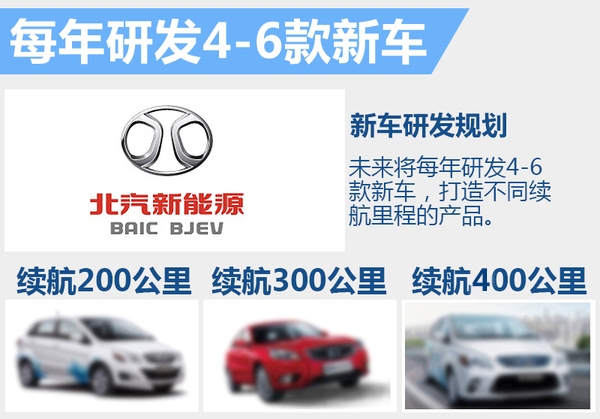 根据规划,北汽新能源未来每年将研发4-6款新车型,形成“2、3、4”(即续航里程200公里、300公里、400公里)、“高、中、低”(即高档、中档、标配三个级别)、“大、中、小”(即车体大小)完整新能源汽车产品组合,为消费者提供更丰富的选择。
