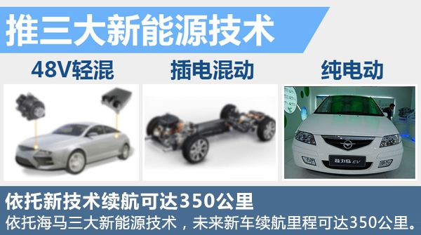 早在2005年,海马就把纯电动车作为新能源战略的研究方向,并已逐步掌握整车与电控系统开发、电池与电机关键部件造型和匹配等核心技术,海马汽车未来还会将包括48V轻混、插电互动、纯电动等在内的新能源技术应用于其关键车型上,进一步扩充海马新能源的竞争势力。按照规划,海马将推出6款新车,其中续航里程最大可达到350公里,更是体现了海马汽车的成熟技术。