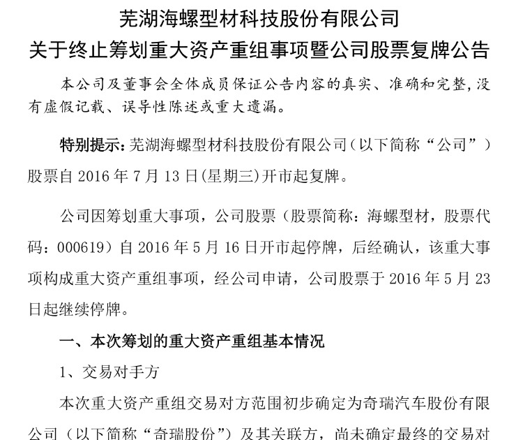 7月12日下午,芜湖海螺型材科技股份有限公司发布复牌公告,称经董事会决议决定放弃并购奇瑞新能源,其原因则是因为奇瑞新能源目前尚无生产资质。