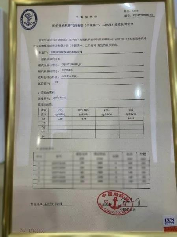 重庆康明斯获全国首份船舶发动机中国第一阶段排放认可