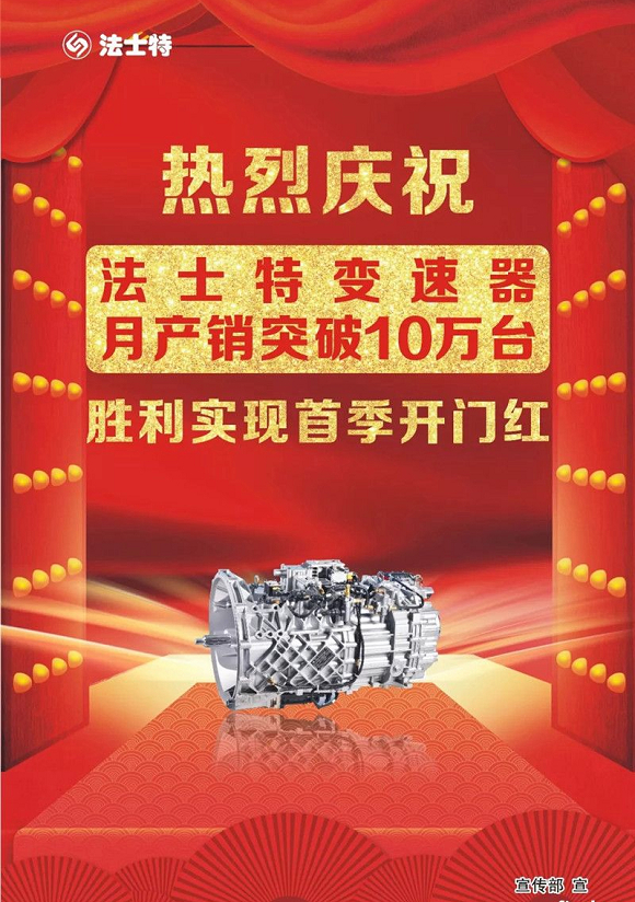 三月份以来,法士特产销两旺,胜利实现首季开门红。法士特变速器月产销突破10万台。