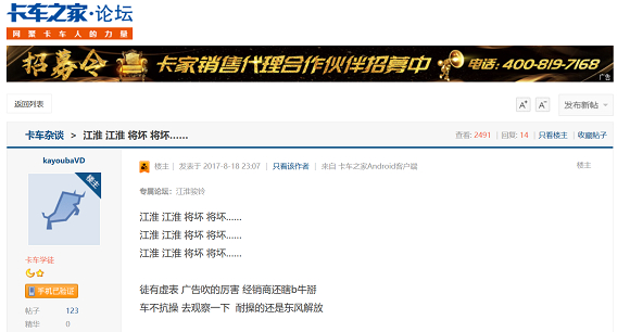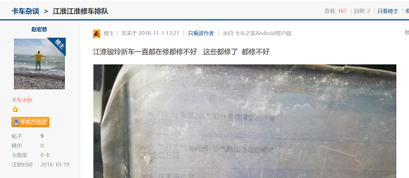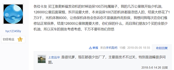 江淮纳威司达的发动机装配后,不断有车主对车辆发动机故障提出投诉,对此卡友间总形象地打趣“江淮江淮,将坏将坏”。