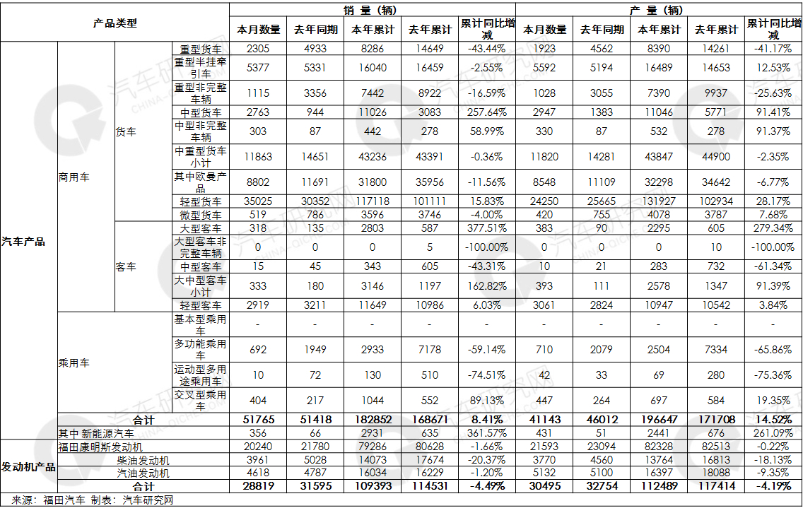 5月9日,北汽福田发布2019年4月份产销数据快报,数据显示1-4月汽车累计销量182852辆,同比增长8.41%;累计产量196647辆,同比增长14.52%。
