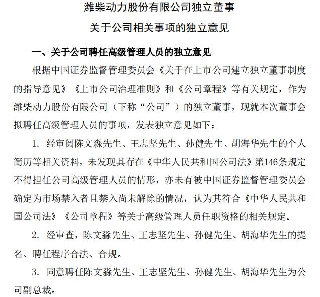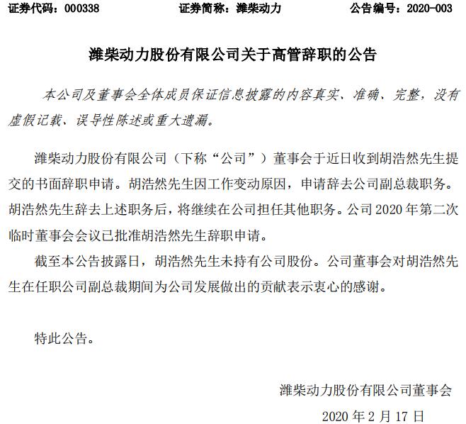 2月17日,潍柴动力发布关于高管辞职的公告,公司董事会于近日收到胡浩然先生提交的书面辞职申请。胡浩然先生因工作变动原因,申请辞去公司副总裁职务。同时,公司董事会同意聘任陈文淼先生、王志坚先生、孙健先生、胡海华先生为公司副总裁。
