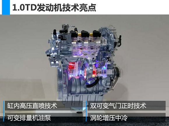 全新1.0TD发动机吸收利用由吉利集团、沃尔沃公司以及德国FEV公司的先进技术研发,主要包括缸内高压直喷、可变排量机油泵、涡轮增压中冷、双可变气门正时等。该发动机可能是此前亮相代号为JLF-3G10TD的三缸1.0TD发动机,最大功率100kW,最大扭矩180Nm。