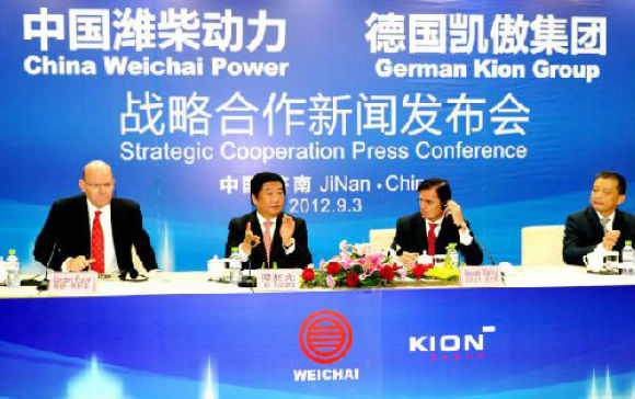 资料图:2012年9月3日,山东重工集团董事长、潍柴动力董事长兼首席执行官谭旭光(左二)、德国凯傲集团首席执行官戈登·里斯克(左一)、高盛集团德国、奥地利和中东欧首席执行官亚历山大·狄比留出席新闻发布会。当日,潍柴动力公司与德国凯傲集团在济南签署战略合作协议。
