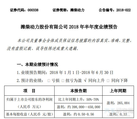 汽车研究网最新消息,7月10日,潍柴公布2018年半年度业绩预告,预告显示公司预计2018年1-6月归属上市公司股东的净利润约39.8亿至45.0亿,同比增长50%-70%。