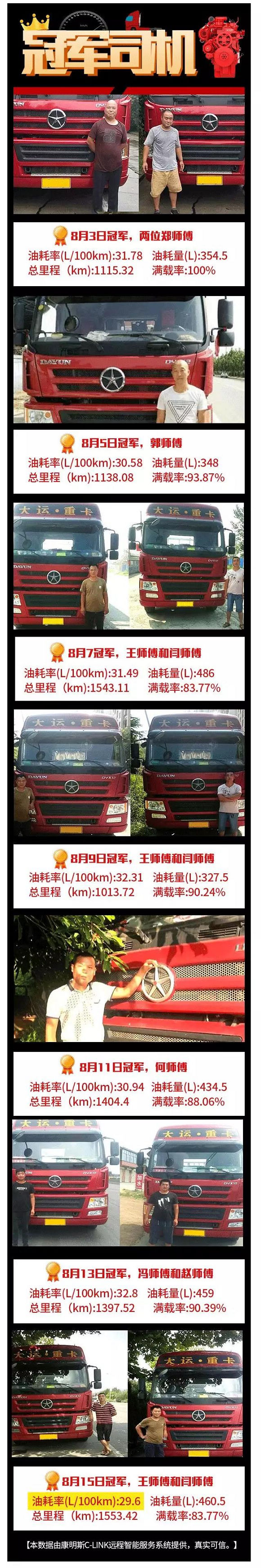 月度节油进步奖,要求比赛车辆每个自然月的总行驶里程在10000km以上,平均满载率(满载+特满载)在70%以上。8月份结束后首次评比,通过比较各参与车辆上月平均油耗率与本月平均油耗率之差,评选出月度平均油耗率降低最多者(前三名)胜出。