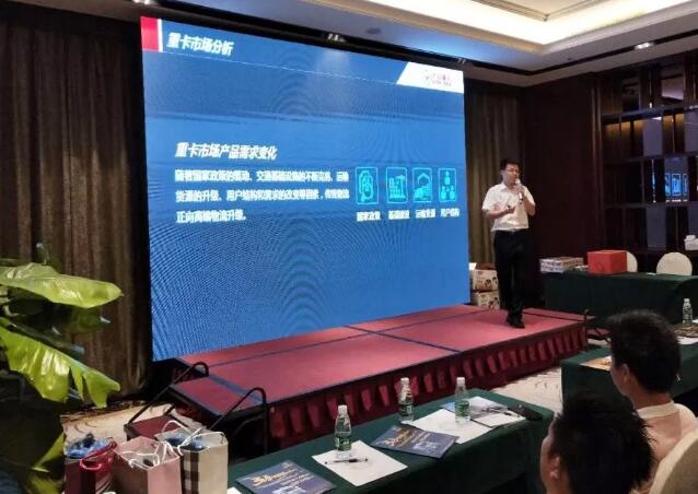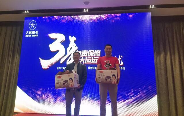 在恢弘大气的大运集团宣传片中,本次推广活动拉开了帷幕,首先,大运重卡区域经理田少磊上台讲解,围绕着N9H远航版在原N9H车型上所进行的“4大升级,46项提升”进行详细讲解。随后,大运重卡区域经理何建就本次会议的主题“三年免责保修,大运远航无忧”服务政策的实施细节进行讲解,大运重卡在整车三年质保的基础上又推出了免责索赔、无条件外出、停运补偿、代用车服务等政策。同时,高安众壹服务站总经理周总也上台表态,坚决将大运重卡优质的服务落到实处,让用户得到实实在在的优惠。