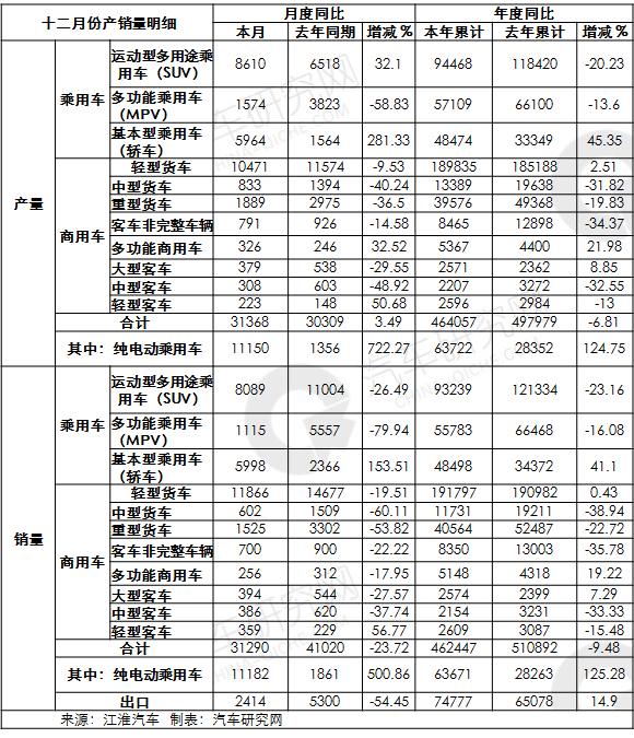 安徽江淮汽车发布2018年12月产销快报,产销均下降