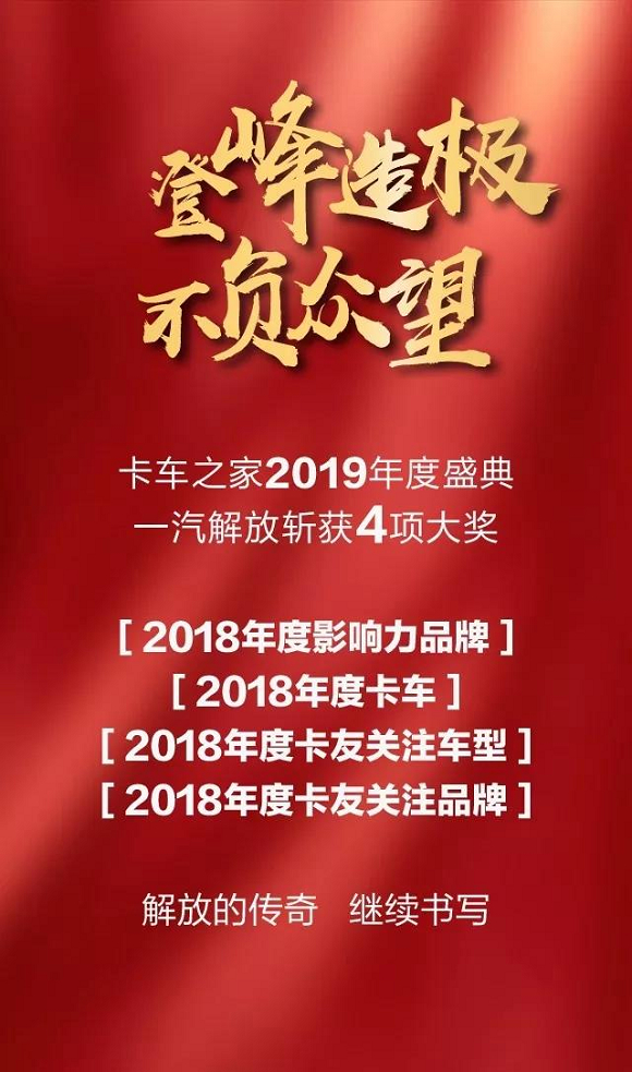 2019年1月10日,卡车之家2019年度盛典在北京举行,本次营销盛典以“新营销 新零售——数字新潮 重塑时代”为主题,一汽解放一力独揽 4项大奖 。
