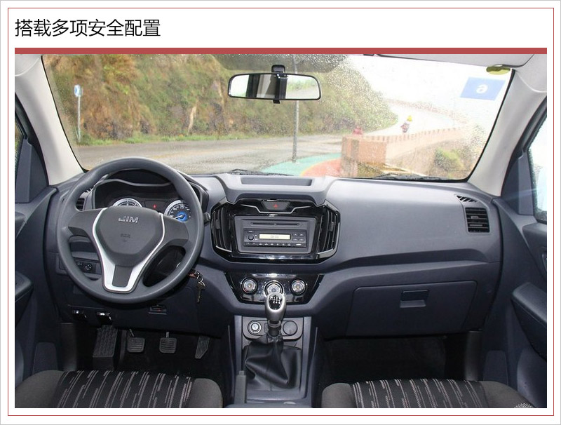 这款皮卡内饰设计较为简洁,以黑色为主色调,配备三辐式方向盘,同时带有JIM标识并且加入银色装饰提升质感。此外,新车还配有ABS防抱死、EBD制动力分配系统、BA刹车辅助系统、倒车雷达等安全装备。另外货箱还有耐磨胶涂层的配备。