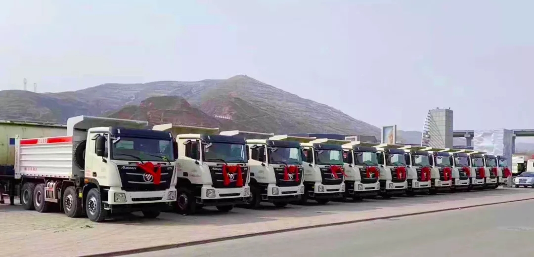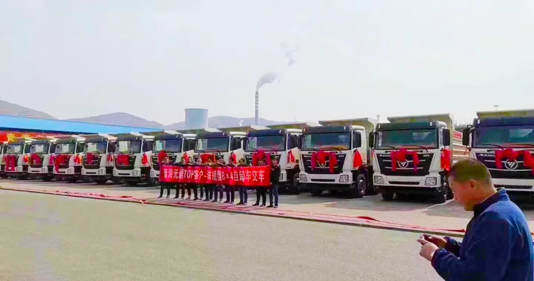 崭新的欧曼GTL8×4法规型自卸车在交车仪式的现场一字排开,车前佩戴的大红花迎风飘扬。如同这车身上的红花一样,预示欧曼GTL8×4法规型自卸车的新主人将开启红红火火的运输生活。