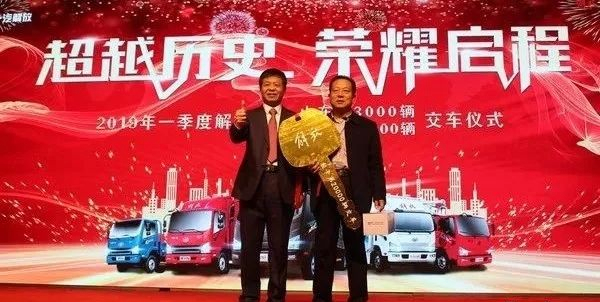 实力彰显,气势如虹。用户交车仪式中,2019年第20000辆解放轻卡车主接过金钥匙及纪念品,各界伙伴共同见证了荣耀的交接时刻。