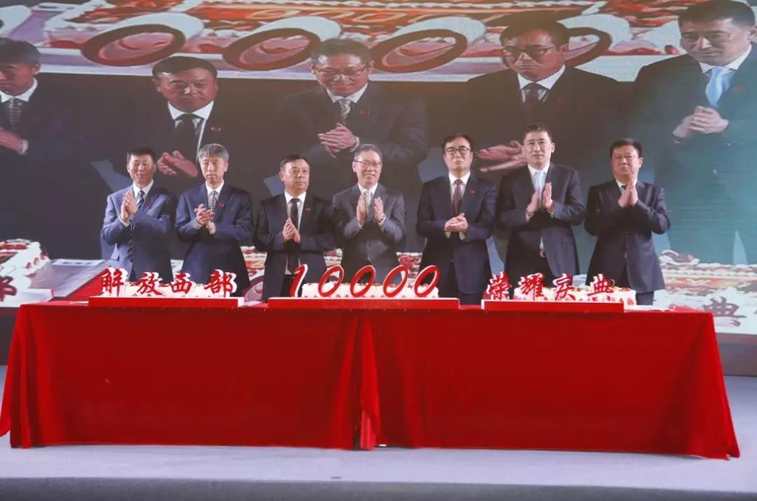 活动现场,在视频回顾一季度解放西部市场销售成绩、工作亮点之后,胡汉杰董事长、王志才总经理、王忠诚厂长、张兵副总经理、于长信副总经理、黄南翔副总经理、李玉峰副总经理共同登台切开蛋糕开启仪式,随着大屏幕上解放雄鹰展翅翱翔,“万辆荣耀 领越传奇”一汽解放西部区域万辆庆典仪式活动正式进入高潮。