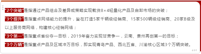 一汽解放汽车销售有限公司副总经理兼西部营销部部长李玉峰谈到:“在接下来的几个季度,西部将秉承年初既定策略,并根据市场变化持续优化,继续以客户为中心,以目标为导向,以满意为标准,围绕营销创新,聚焦2个突破,3个提升,3个第一和3个万辆,紧抓新机遇,打造新的增长点,力争实现2019年销量破3万目标。”