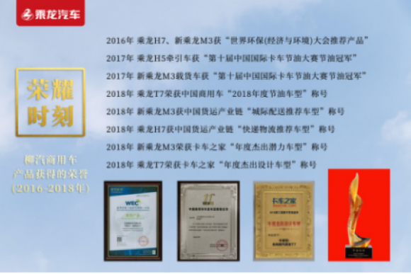2016-2017可谓是乘龙汽车产品爆发年,陆续推出乘龙T7、乘龙H5、新乘龙M3、乘龙L3、乘龙T5、乘龙L2等全新平台产品,到2018年已完成重型、准重、中型、轻型四大平台1+1双子星布局:乘龙H7+T7、乘龙H5+T5、新乘龙M3+L3,乘龙L2形成高、中端及经济型搭配 , 组合式进攻商用车主流细分行业,为行业用户带来全新价值体验,因此获得无数殊荣。