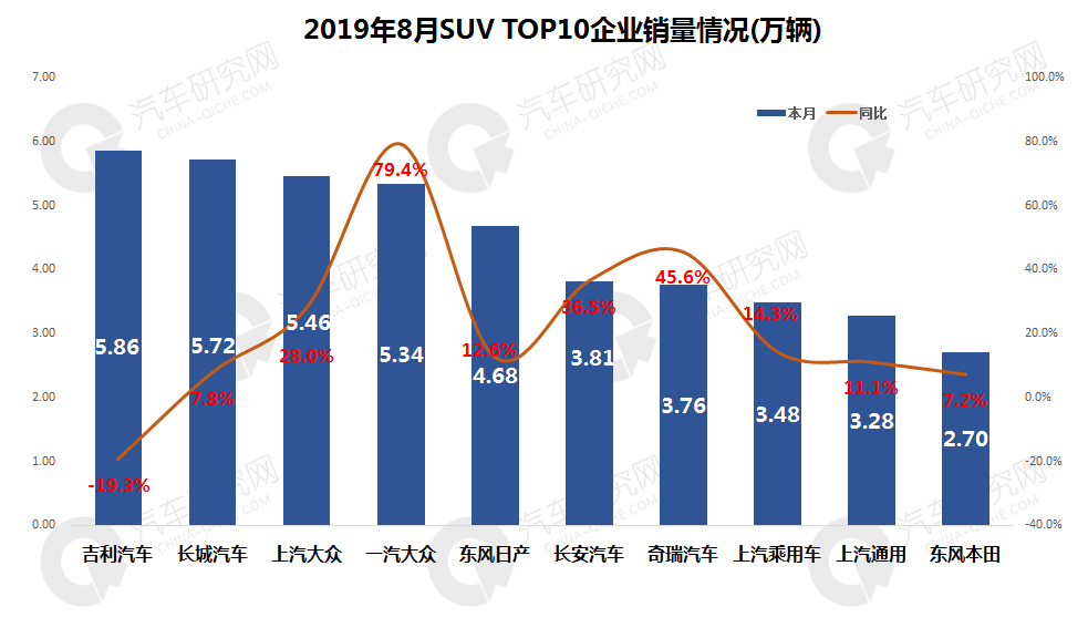 2019年8月SUV销量:自主SUV销量瑶瑶领先 仅吉利同比出现下滑