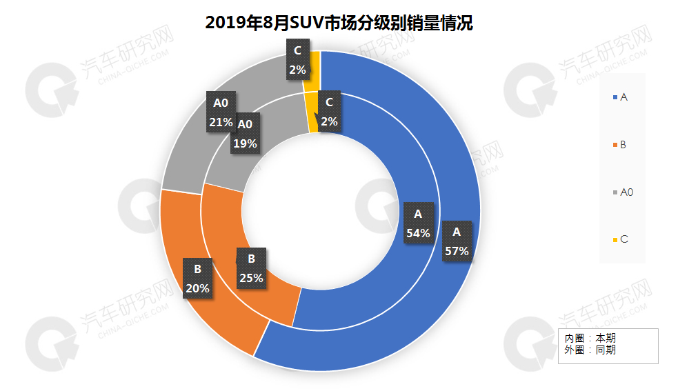 从级别来看,A级SUV仍占据一半的市场,份额则下降至54%;B级车型次之份额上升至25%;A0级SUV市场份额下降至19%,C级市场份额保持不变。