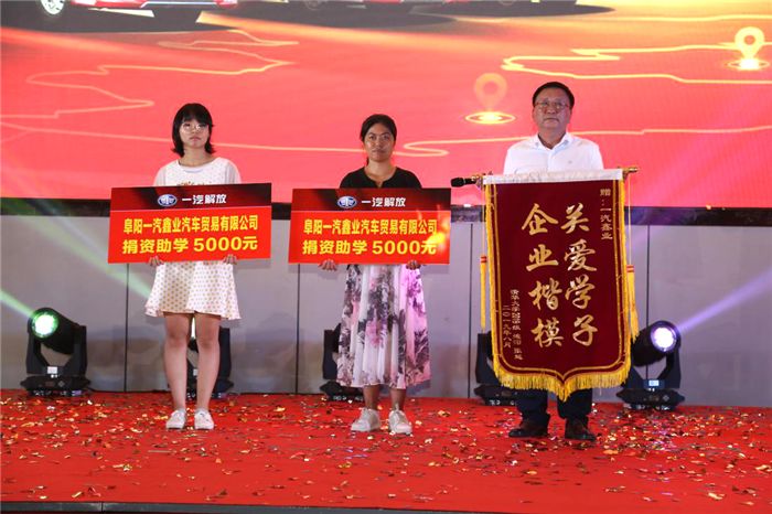 作为国车长子,一汽解放始终致力于公益事业,这份爱心已在广大卡友之间得到广泛传播。作为解放大家庭一份子,一汽鑫业秉承解放致力于公益事业的精神,已经持续15年之久资助贫困学生。借此机会金榜题名的受资助学生来到现场亲自送上锦旗,一汽鑫业投资人 孙岩 先生再次捐资助学,助力莘莘学子,以此体现企业的社会责任。