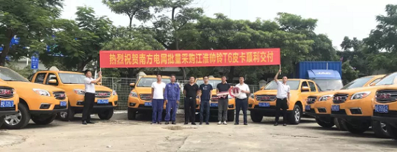 近日,南方电网批量采辆江淮帅铃T6皮卡圆满交付,该批车辆是2018年11月批量采购帅铃T6皮卡后的又一批量续购。南方电网相关负责人参加交车仪式。