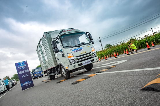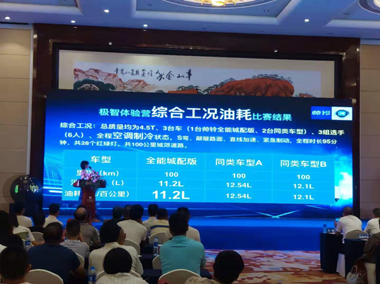 嘉兴站的活动现场,正好遇上了台风天气,风雨无阻,现场赛事依然激情似火。帅铃全能城配版与两款市场同类型展开现场PK,在总质量4.5T工况下,经过S弯道、颠簸路面、直线加速等环节,100公里城郊道路的比赛,帅铃全能城配版采用车联网后台与五环仪表读数,分别测算综合工况油耗。最终由夏本增驾驶搭载安徽康明斯152马力的帅铃全能城配版以11.2L的好成绩夺得冠军,百公里油耗比市场同类车型低1升。