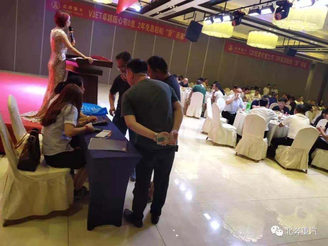 2019年7月27日,由北奔重汽主办,聊城市华源汽车销售有限公司承办的北奔V3ET精英版推介会在东阿县泰悦大酒店成功举办。来自东阿县及周边的用户120余人参加了本次推介会。通过近距离的产品实物讲解,传递北奔价值,让现场客户深切感受到北奔的品牌价值和产品定位。
