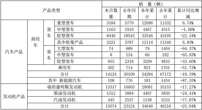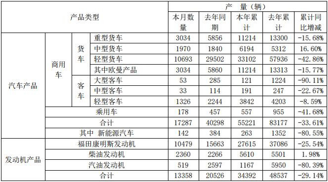 在大、中型客车方面,福田汽车2月销售大、中型客车(包含非完整车辆)82辆,同比下降90.27%;1-2月,福田大、中型客车(包含非完整车辆)累计销售145辆,同比下降90.91%。