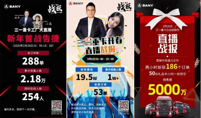 特别策划了3场助力抢购直播活动,都斩获了不错的战绩,其中在抢购1元预订阶段的首场直播便实现288单的销量,而在最后正式抢购阶段更是获得了186个3000元大定订单,这一直播战绩不仅在行业内位于前列,更开创了重卡直播卖车的先河。