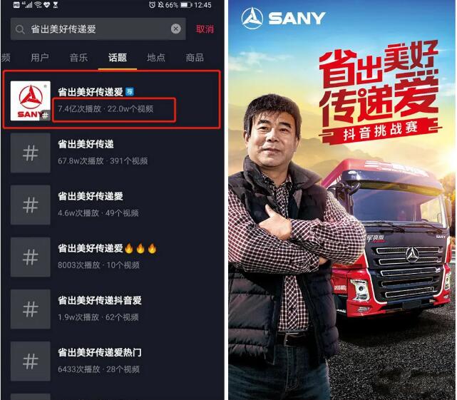 在活动期间,三一重卡联合抖音为卡车司机量身打造了“省出美好传递爱”公益抖音挑战赛,这是重卡行业第一个为卡车司机打造的挑战赛,通过挑战赛,让全社会更多的人关注卡车司机,同时更尊重卡车司机。目前该话题累计播放量已达到7.4亿播放量,超过21万个视频参与,多次进入抖音热门排行榜前十,极大提升了卡车司机的关注度和改变了大家对卡车司机的形象。