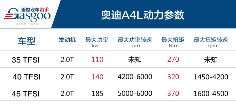 新款奥迪A4L全系搭载2.0T和7速双离合的动力组合,并标配12V微混系统,按照动力调教不同,新款奥迪A4L分为35TFSI、40TFSI、45TFSI三个动力配置。35TFSI最大功率为110kW(150马力),最大扭矩270Nm,40TFSI的最大功率为:140kW(190马力),峰值扭矩为320Nm,40TFSI的最大功率为:185kW(252马力),峰值扭矩为370Nm,根据配置不同,还会提供搭载适时四驱的quattro版本。