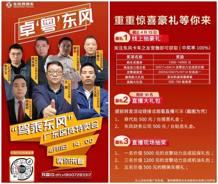 4月11日,由东风商用车广东商代处主办,广州东贸佛山分公司协办的“卓‘粤’东风-广东区域特卖会”线上直播活动,成交100余辆,达成购车意向220余辆。
