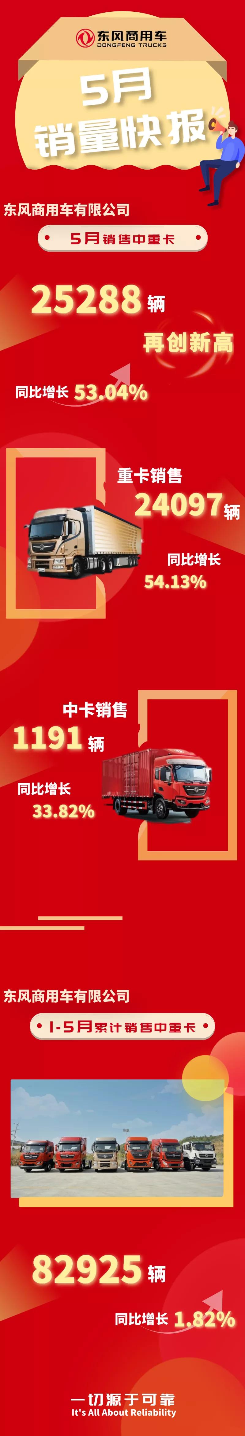 据东风商用车官微最新消息,东风商用车有限公司5月销售中重卡25288辆,再创新高,同比增长53.04%。
