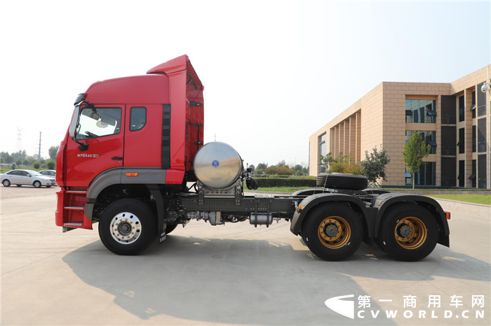 这款车搭载重汽曼技术MT13国六天然气发动机,曼技术前后桥可以选配康迈或SKF免维护轮端,整车还使用了曼技术全新轻量化车架,轻量化平衡轴与悬架,变速箱、气瓶支架、轮圈均使用铝合金材料。
