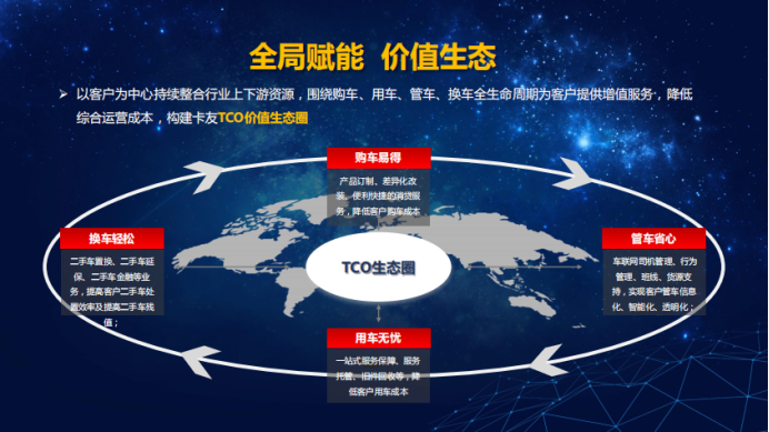 为提升客户运营价值,为客户提供高效、便捷的一站式服务,乘龙围绕用户全生命周期客户价值,精准击破用户痛点,秉承“TCO价值生态圈”的理念,致力于为客户提供购车易得、管车省心、购车无忧、换车轻松的全方位运营解决方案。在购车阶段为用户提供产品定制、差异化改装、快捷消贷等增值服务,让“购车易得”的概念由虚入实真正落地;在“管车省心”上,为用户提供车联网司机管理、行为管理、班线、货源支持等增值服务,实现客户管车信息化、智能化、透明化;此外,乘龙通过一站式服务保障、服务托管、二手车业务等服务,助力客户轻松实现“用车无忧”和“换车轻松”。