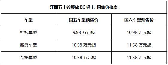 在江西五十铃翼放ES轻卡荣耀上市之际,江西五十铃翼放轻卡再推一将,全新翼放EC系列轻卡启动全国预售:国五系列产品的预售价9.98万元起,国六系列产品的预售价10.98万元起。